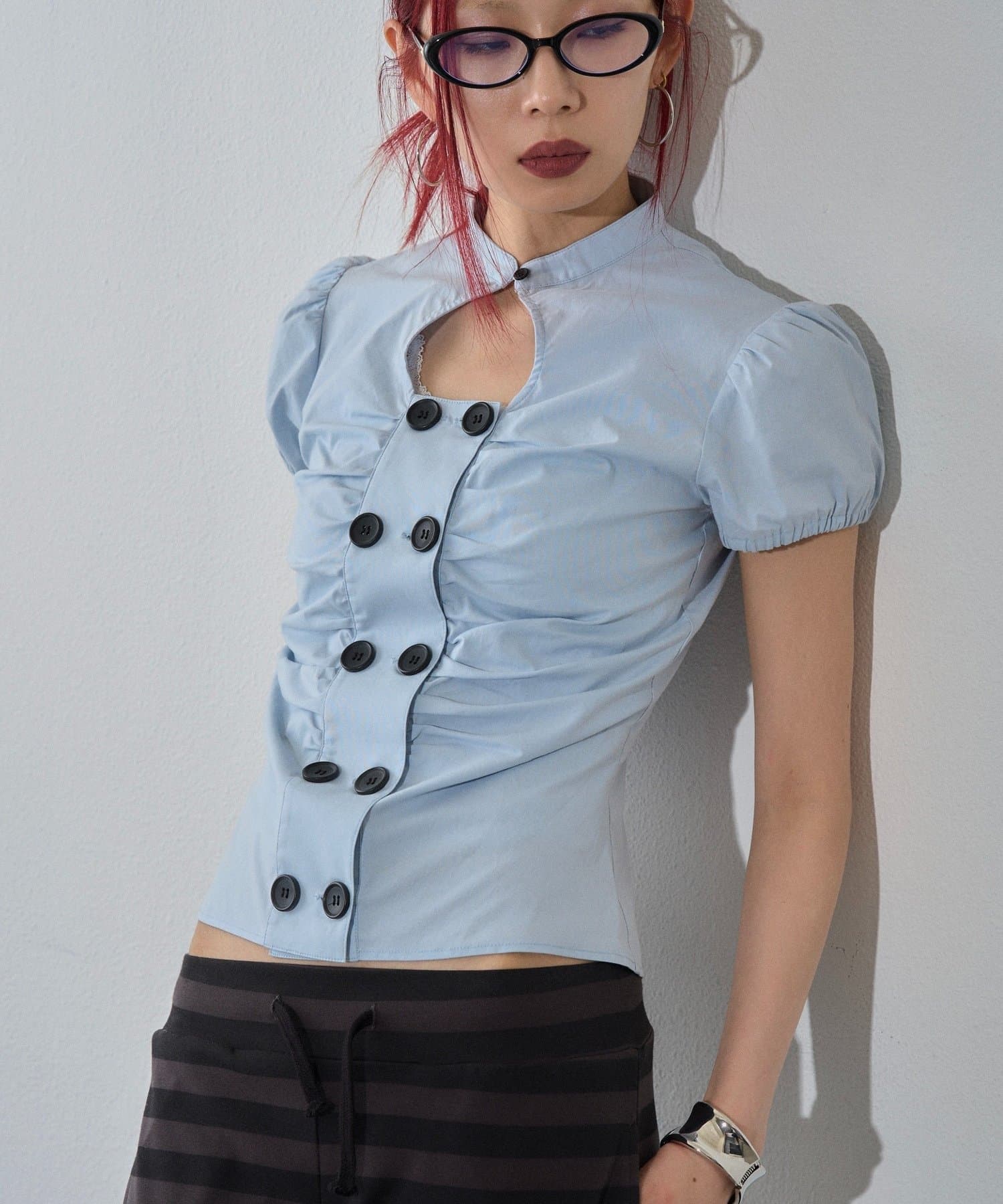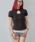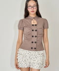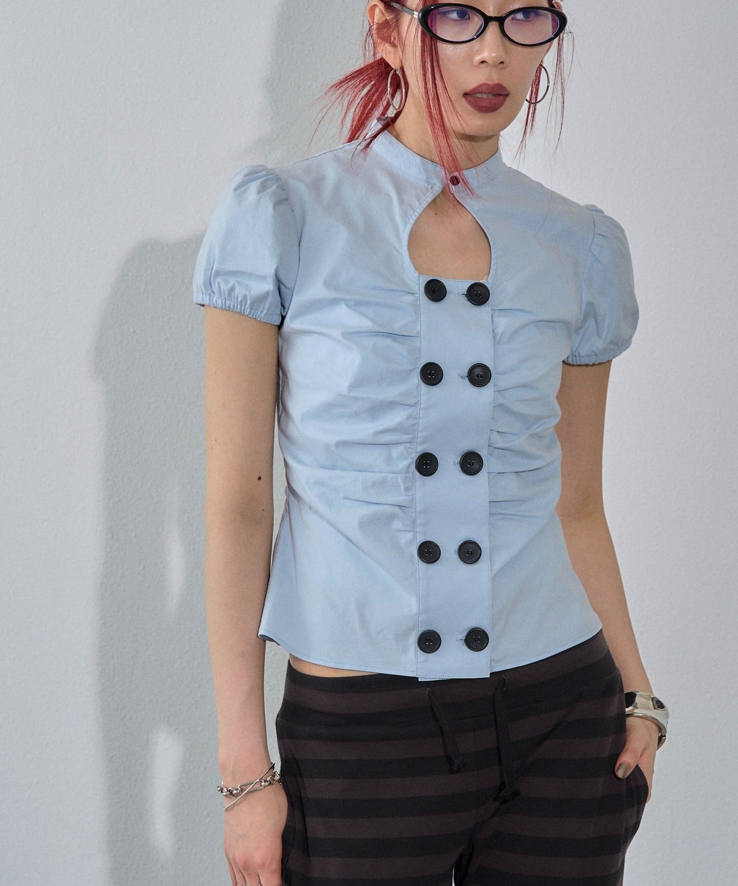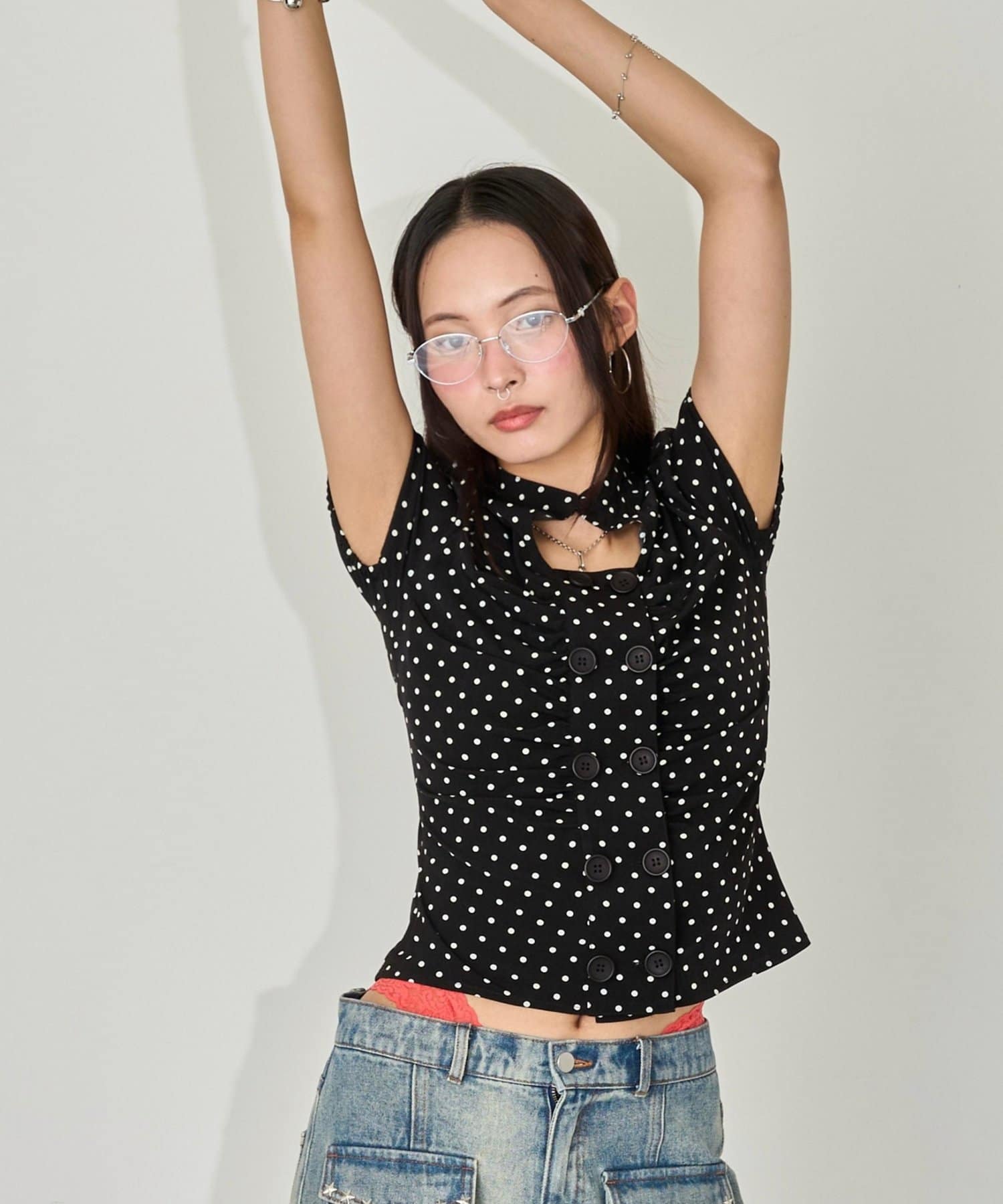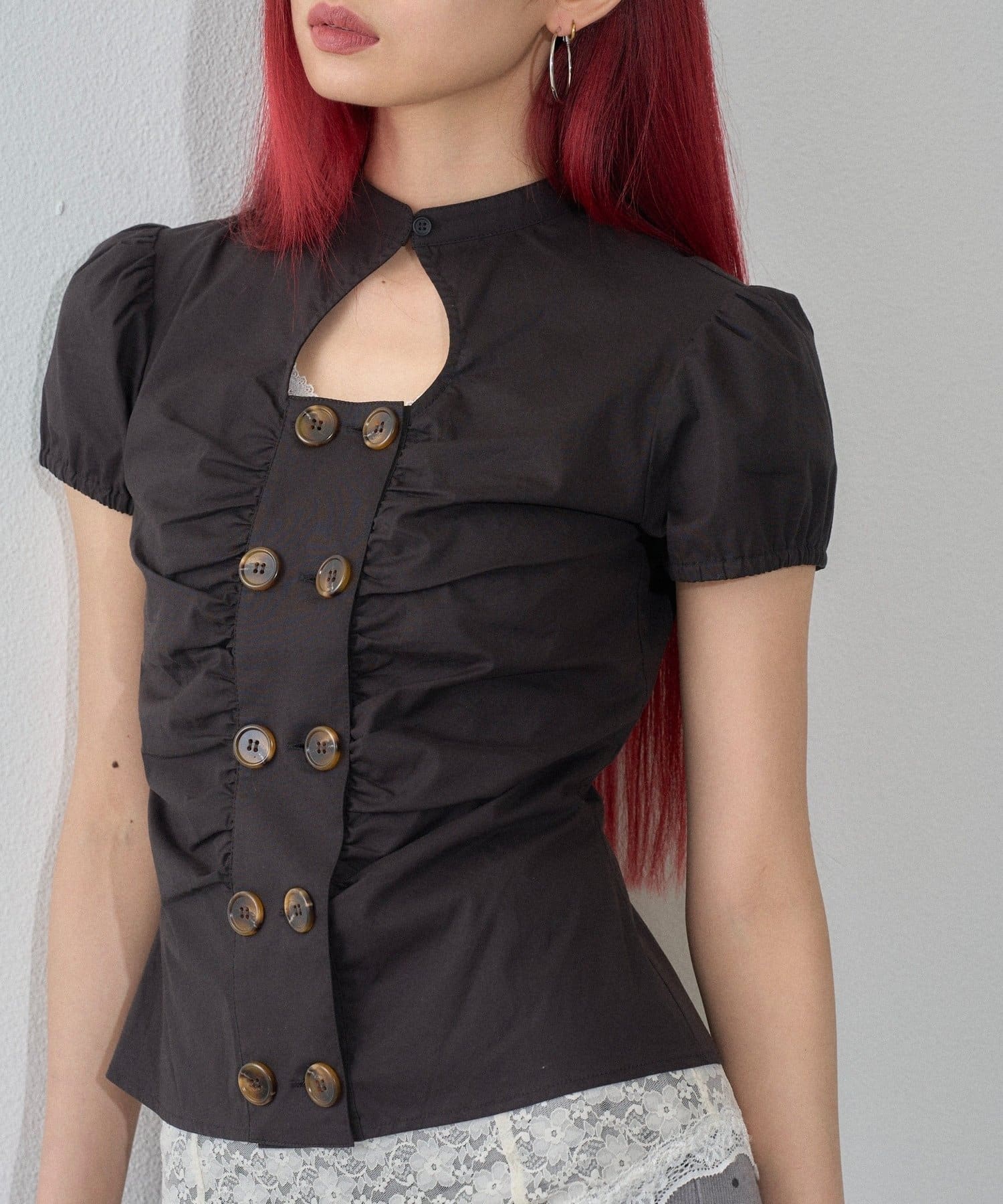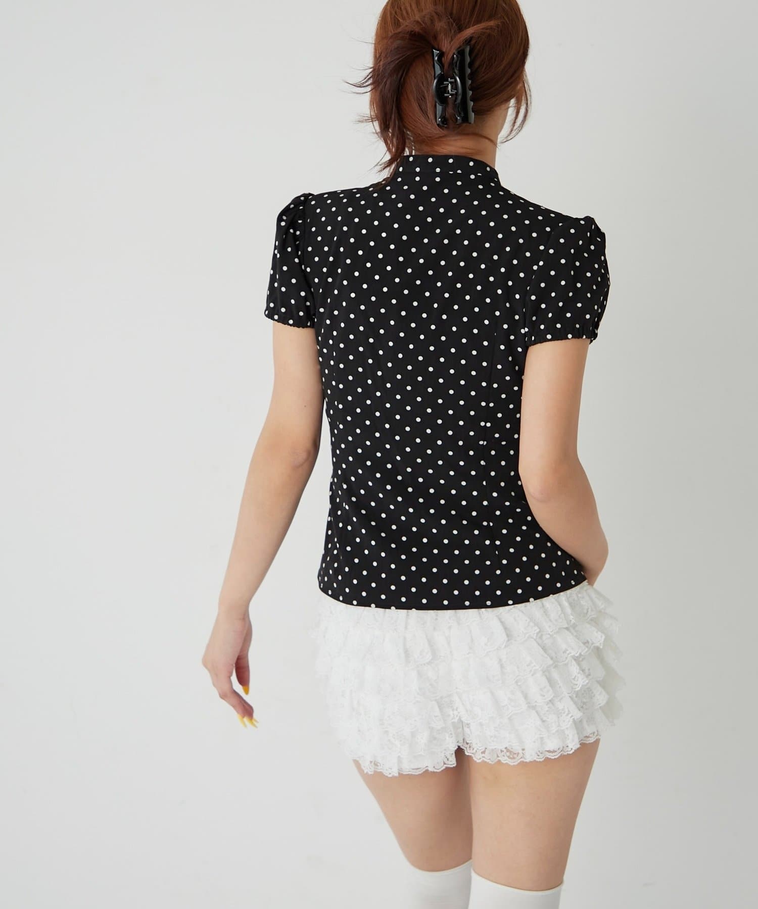 Wボタンギャザーブラウス(ドット柄・無地)