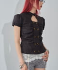 ・中心によるギャザーが特徴的でウエストのくびれが綺麗に見えるトップス。