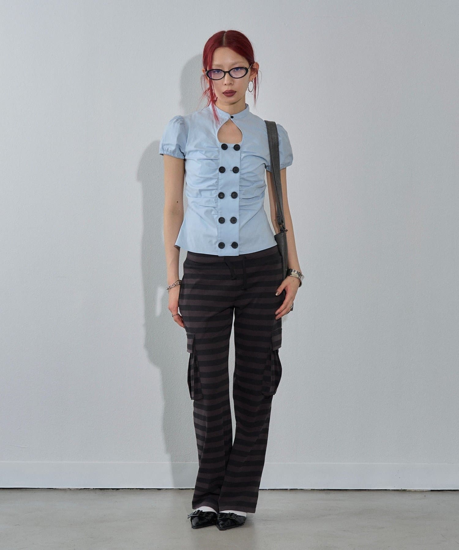 ・トップスのボタンを目立たせてボトムスはシンプルに。