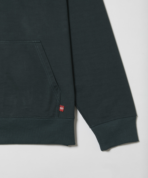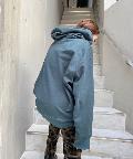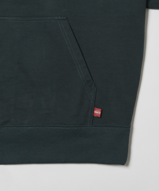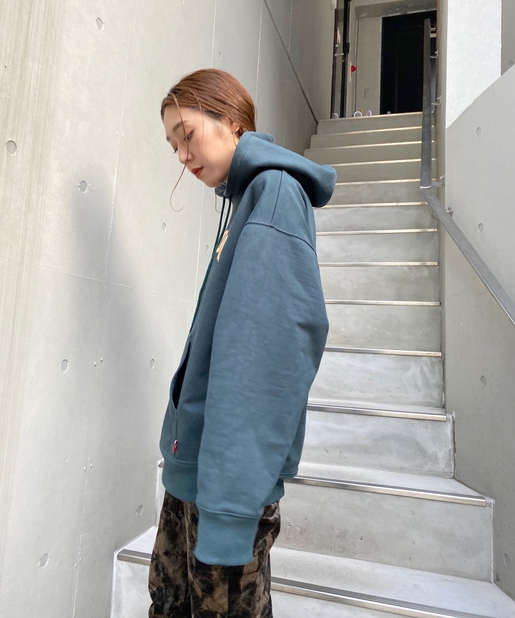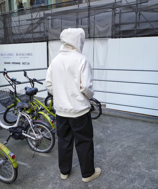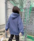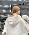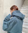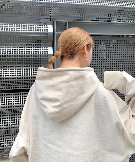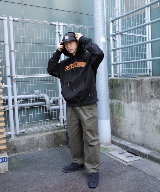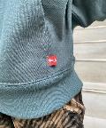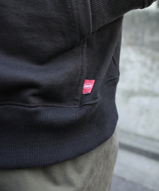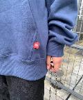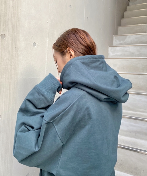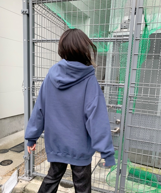・がっしりしたヘビーウェイトの生地感、首回りもリブタフで丈夫です。大きめのフードは顔をすっぽり覆うことができ、防寒も◎