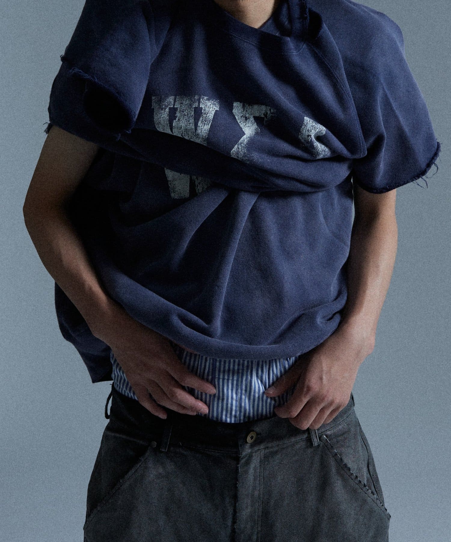 ヴィンテージ感あふれるダメージ加工が施された半袖スウェット