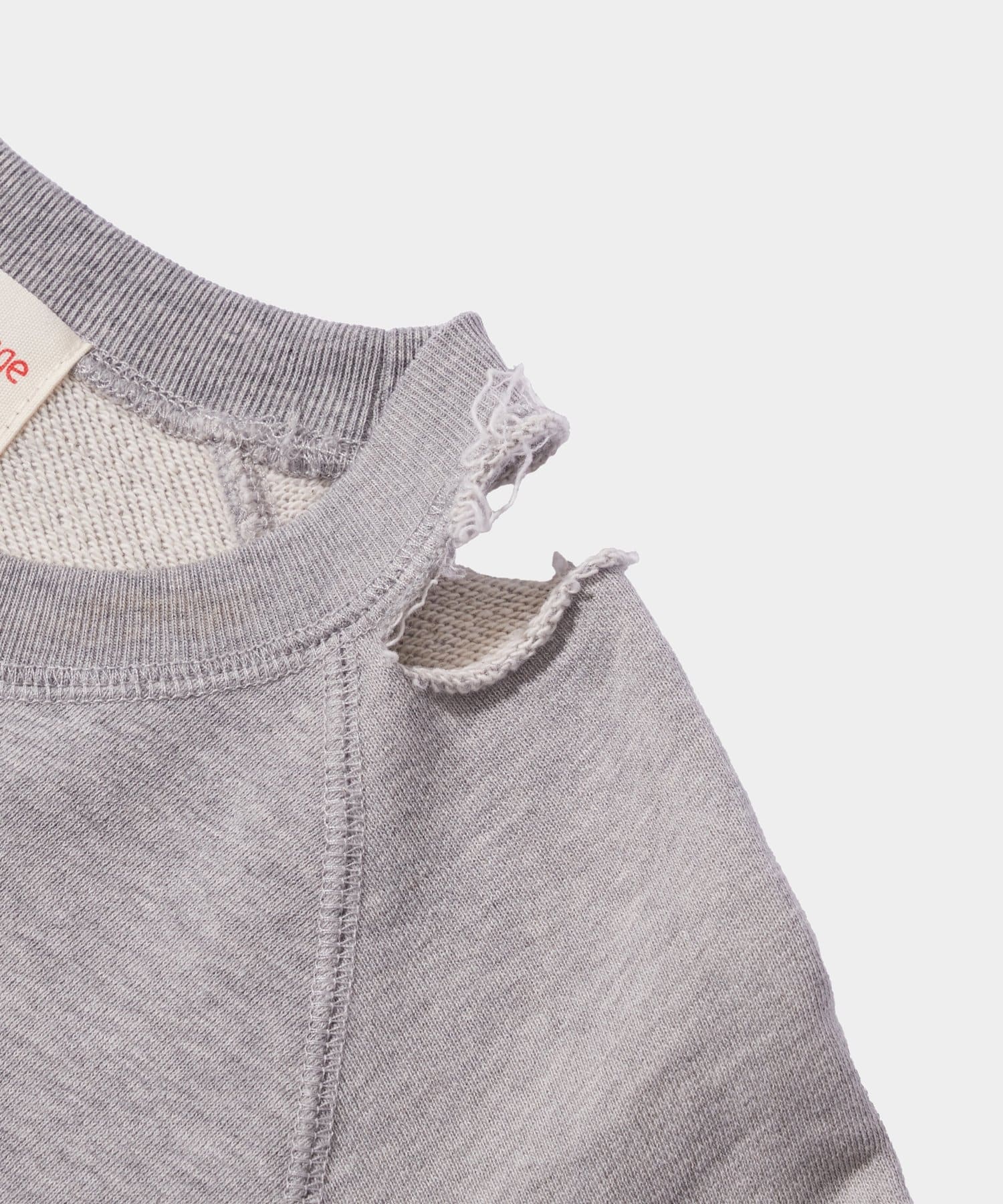 ・左肩のダメージがアクセントな一枚のスウェットTシャツ。