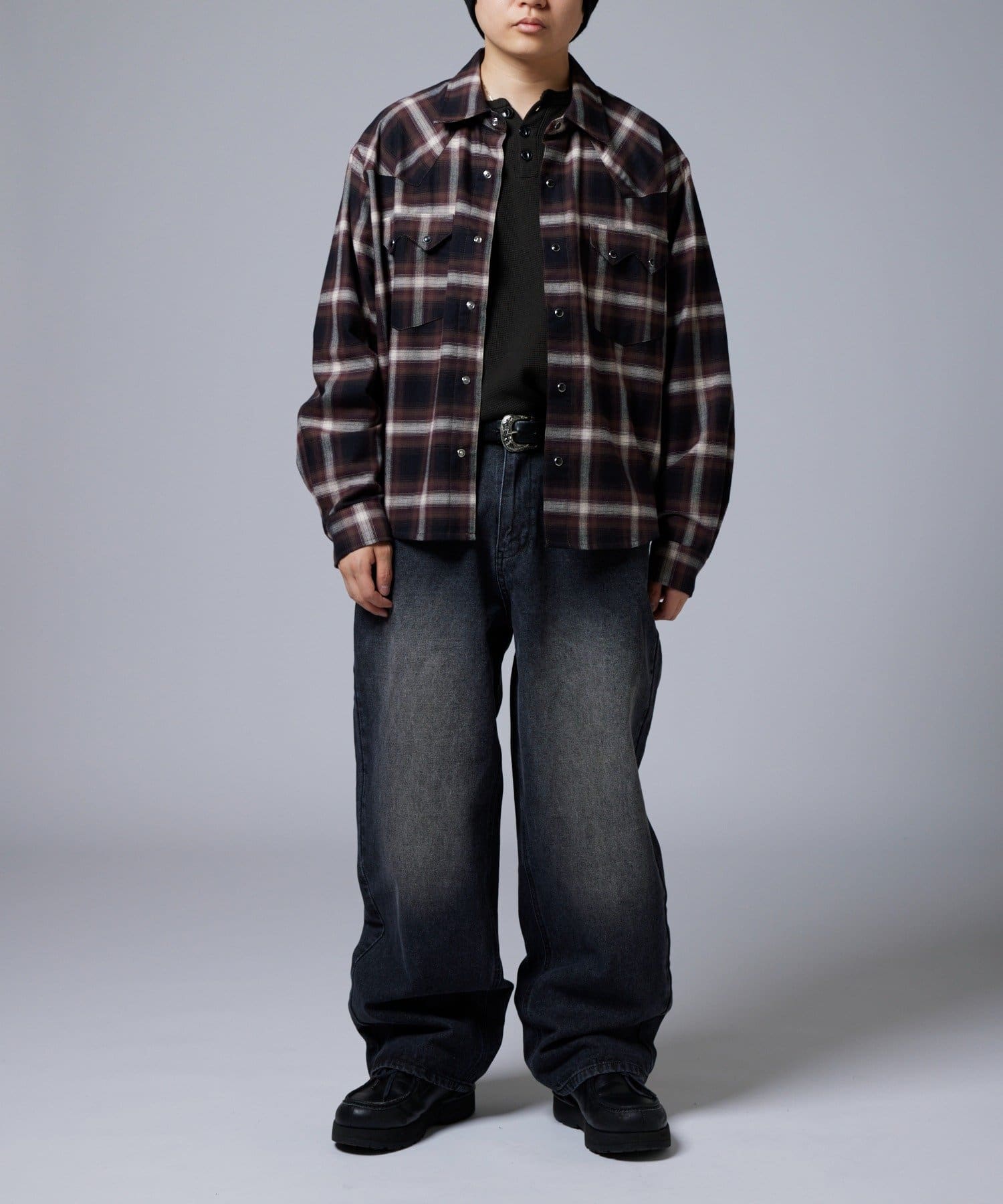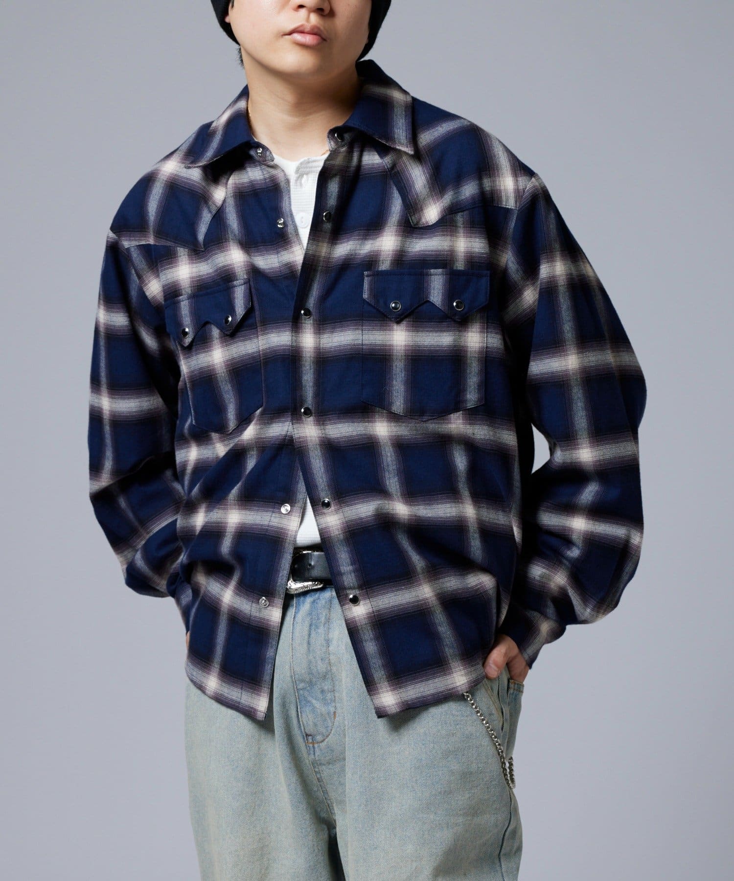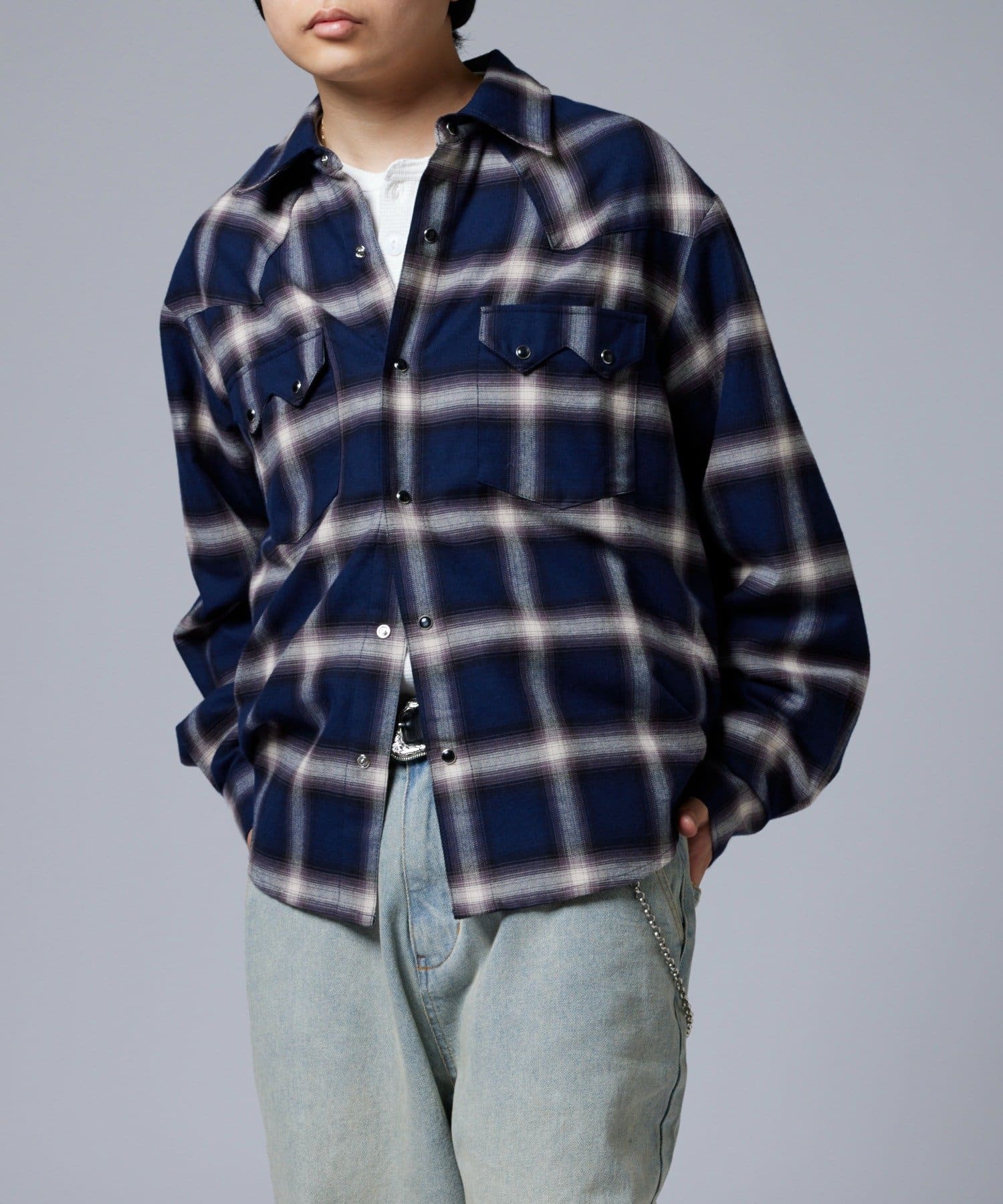 ・落ち着いたトーンのオンブレチェックとウエスタンディティールが普段のコーディネートをワンランク引き上げます。